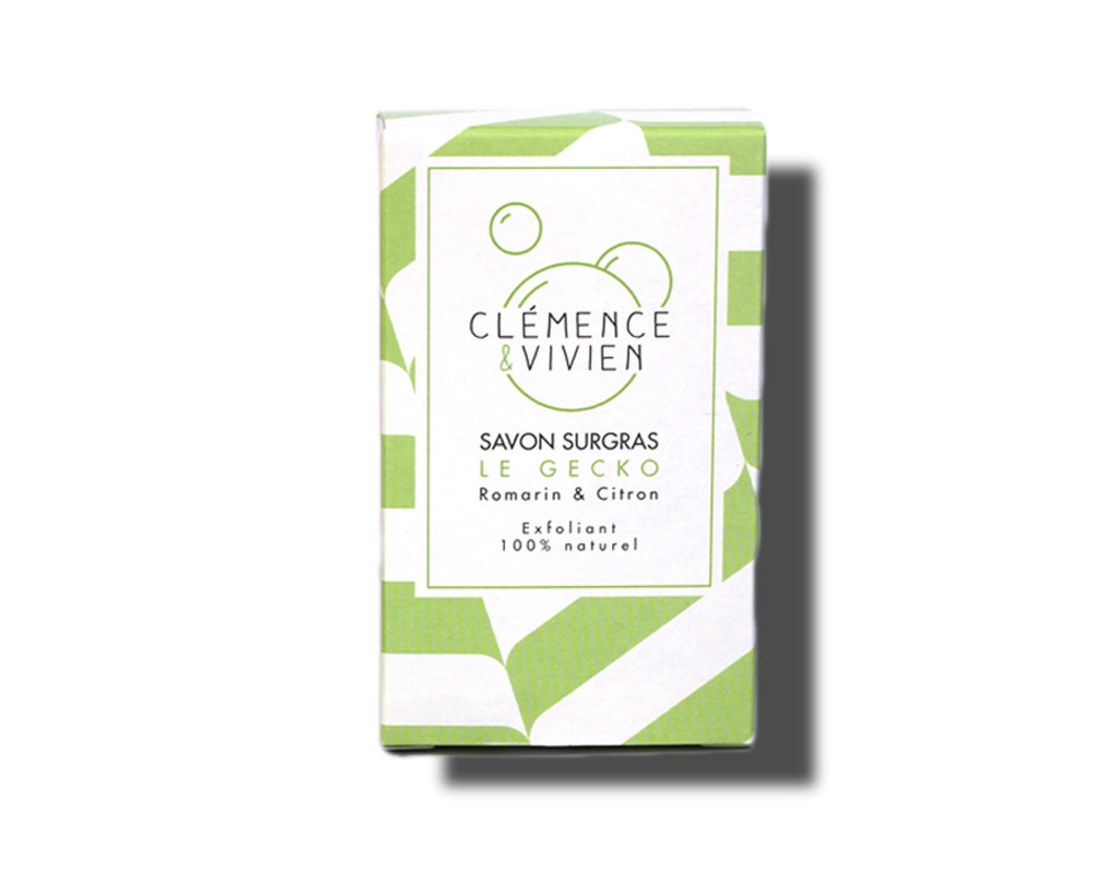 La marque de cosmétiques naturels Clémence & Vivien vous propose le savon à froid - le gecko. Un savon exfoliant qui rend votre peau douce et lisse. Composé de graines de pavot, qui gomme la peau et les cellules mortes, d'argile verte et d'huiles essentielles qui nettoient, purifient et équilibrent les peaux mixtes à grasses. Conçu sans test sur les animaux en France, ce savon saponifié à froid est vegan et 100% naturel. Vous pouvez également l'utiliser pour laver vos cheveux.