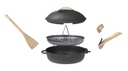 La fabuleuse poêle à tout faire de Cookut couleur météore, c'est 8 ustensiles regroupés dans une poêle ingénieuse. Elle est composée d'un couvercle avec système d'auto-arrosage des viandes, un panier vapeur, une spatule, des poignées détachables courtes et longues. Elle fait office de poêle et sauteuse, de cocotte et casserole, de friteuse et cuisson vapeur et fait office de moule et plat au four. Elle sera idéale pour : les oeufs au plat, poulets rôtis, légumes vapeur, blanquette de veau, frites, gratin, gâteaux, pizza... Tout est possible !